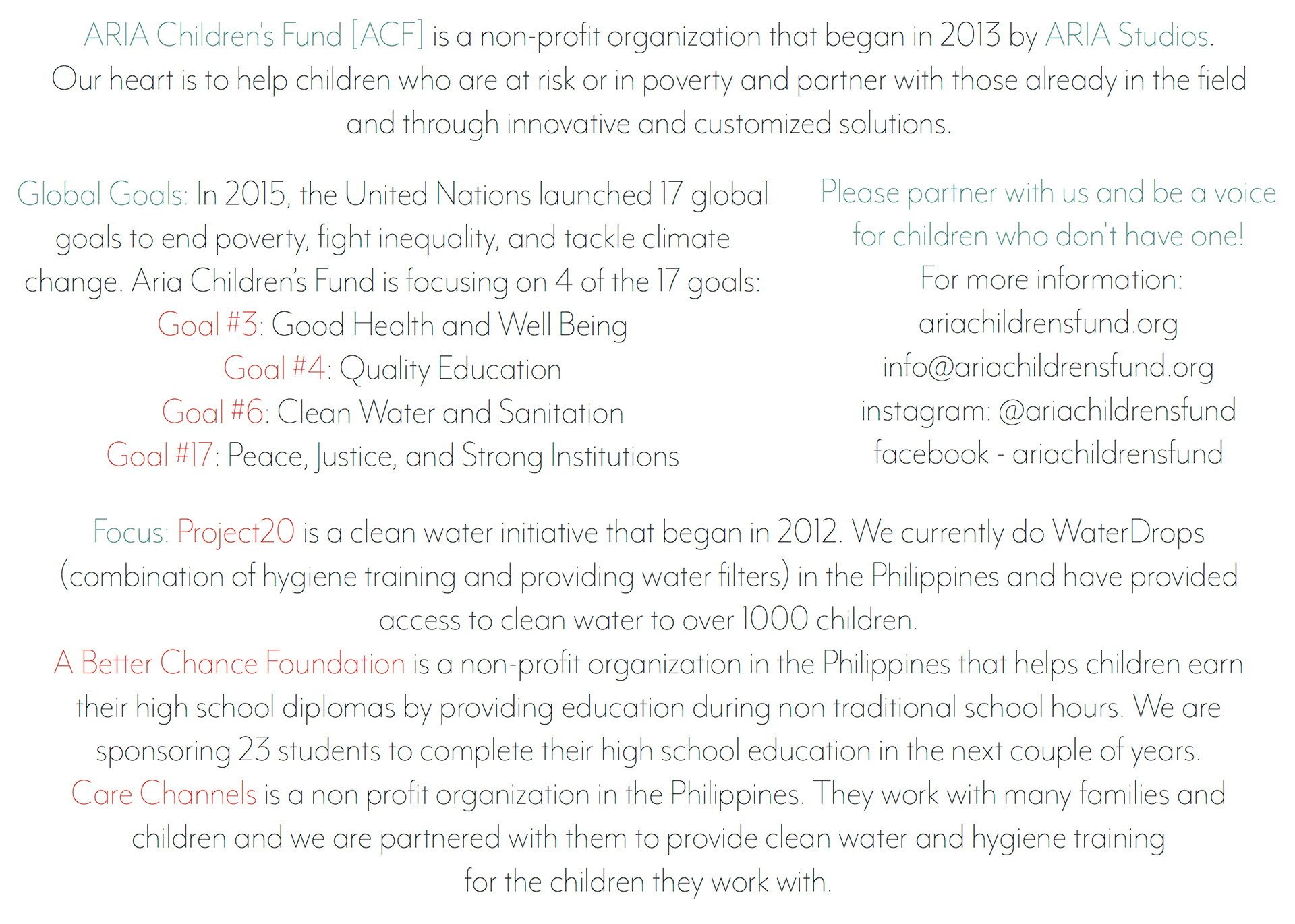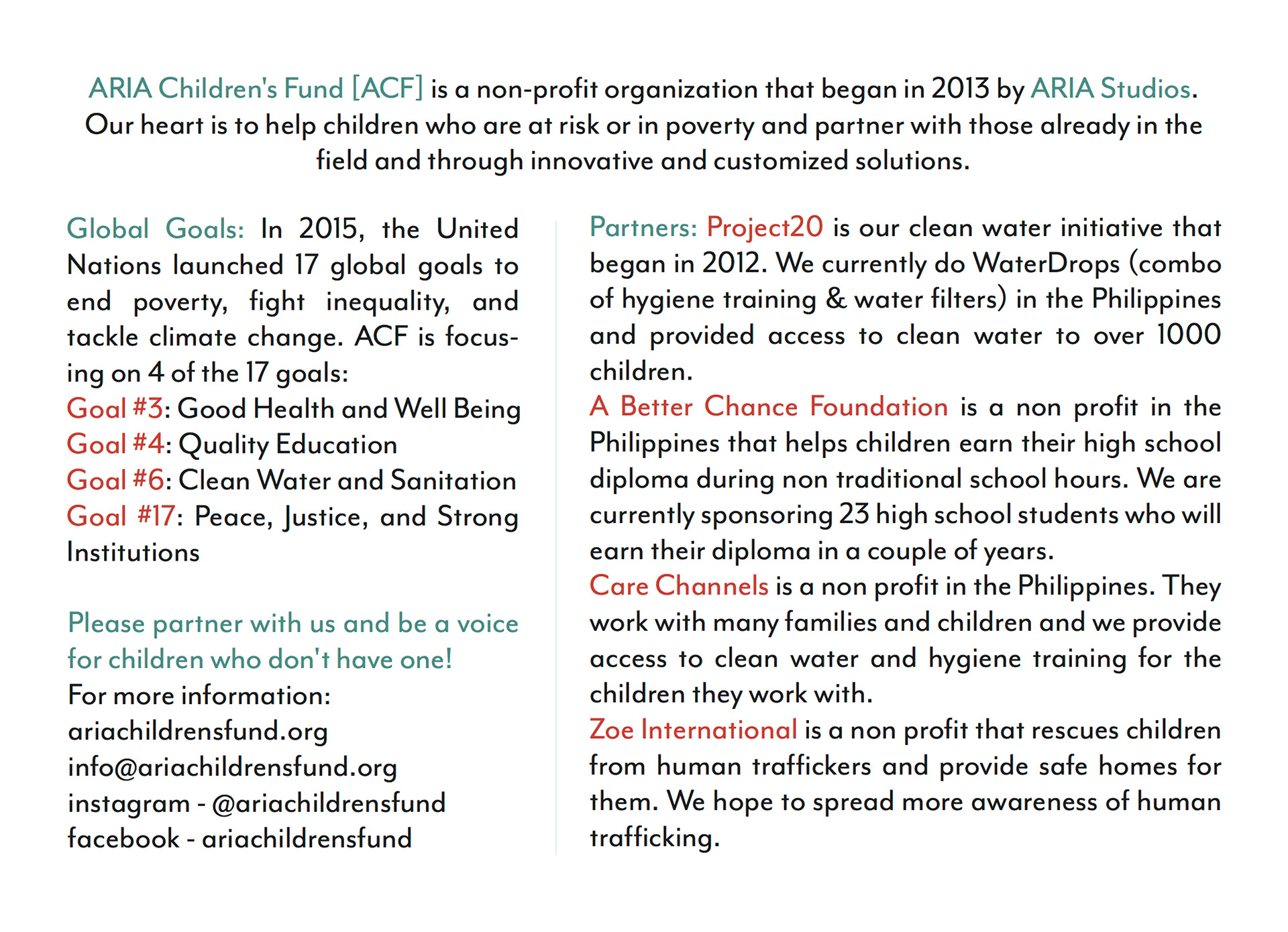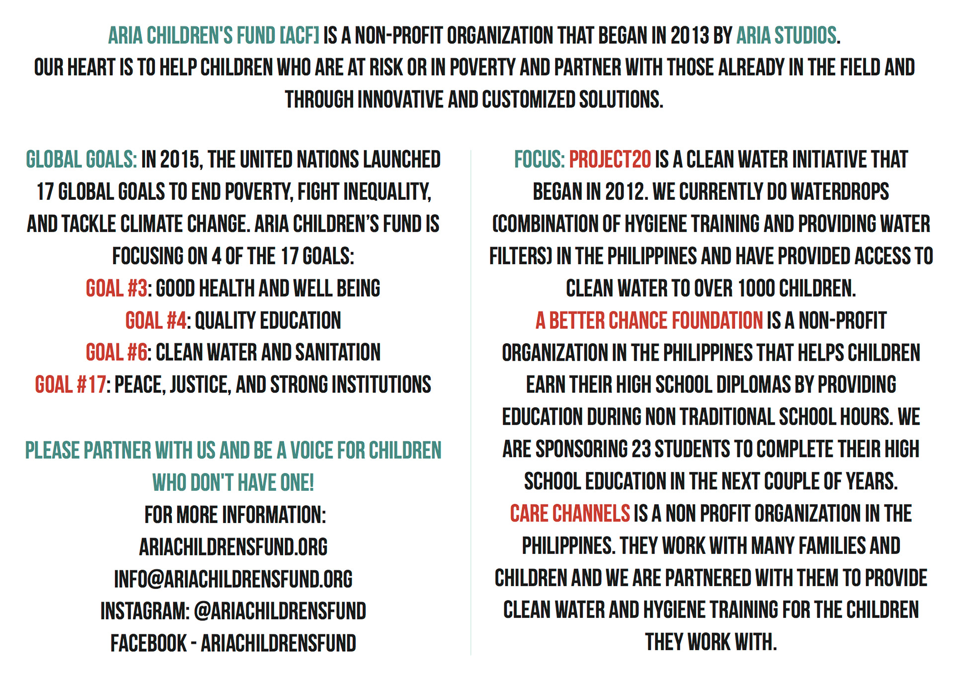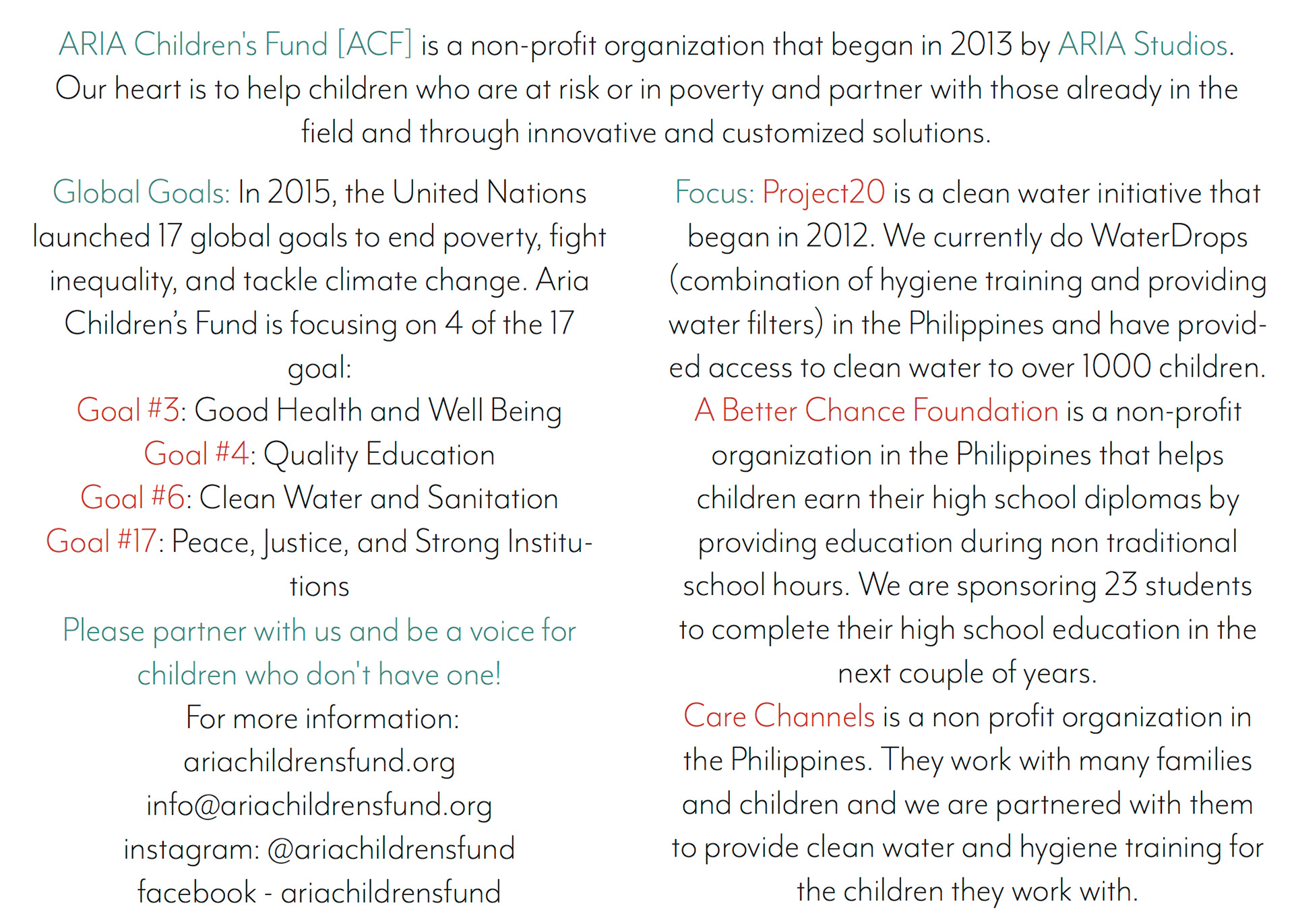 ARIA Children's Fund is a non-profit organization that began in 2013 by ARIA Studios. Their heart is to help children who are at risk or in poverty and partner with those already in the field and through innovative and customized solutions.